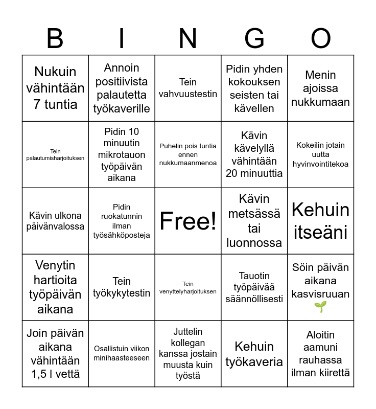 This bingo card has a free space and 24 words: Tein työkykytestin, Osallistuin viikon minihaasteeseen, Puhelin pois tuntia ennen nukkumaanmenoa, Join päivän aikana vähintään 1,5 l vettä, Menin ajoissa nukkumaan, Nukuin vähintään 7 tuntia, Tein palautumisharjoituksen, Annoin positiivista palautetta työkaverille, Kävin metsässä tai luonnossa, Tein venyttelyharjoituksen, Kävin kävelyllä vähintään 20 minuuttia, Kävin ulkona päivänvalossa, Tauotin työpäivää säännöllisesti, Söin päivän aikana kasvisruuan 🌱, Pidin 10 minuutin mikrotauon työpäivän aikana, Kehuin työkaveria, Kehuin itseäni, Tein vahvuustestin, Kokeilin jotain uutta hyvinvointitekoa, Pidin ruokatunnin ilman työsähköposteja, Aloitin aamuni rauhassa ilman kiirettä, Venytin hartioita työpäivän aikana, Pidin yhden kokouksen seisten tai kävellen and Juttelin kollegan kanssa jostain muusta kuin työstä.
