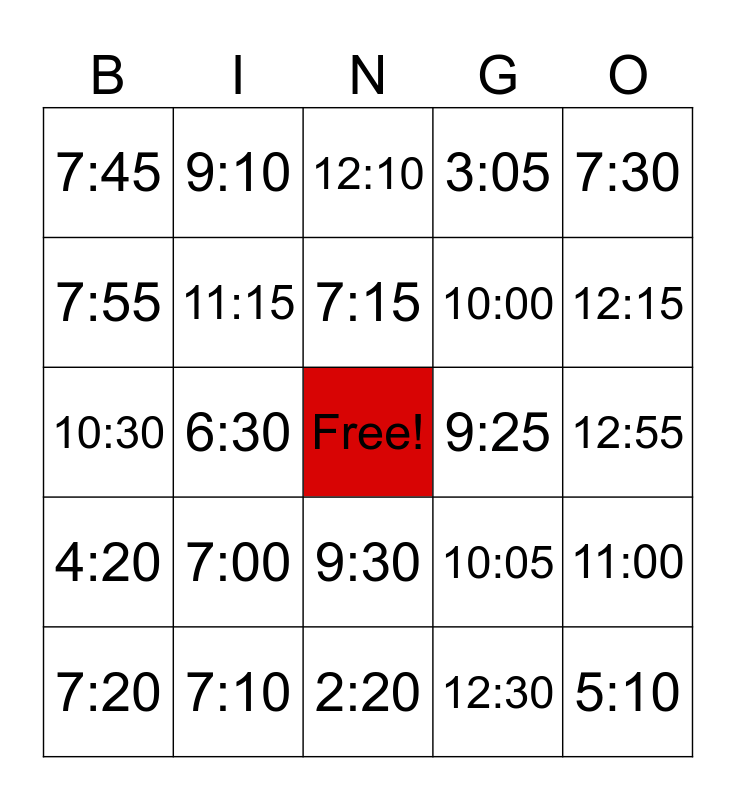 This bingo card has a free space and 24 words: 7:00, 7:10, 7:15, 7:20, 7:30, 7:45, 7:55, 9:10, 9:25, 9:30, 10:00, 10:30, 10:05, 11:00, 11:15, 12:30, 12:55, 12:10, 12:15, 6:30, 5:10, 4:20, 3:05 and 2:20.