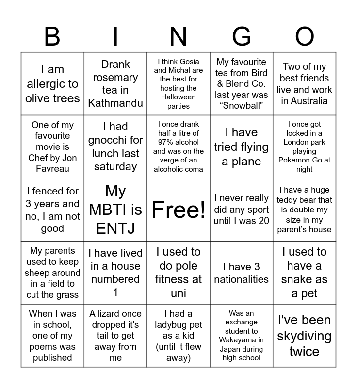 This bingo card has a free space and 63 words: When I was a kid my hobby was saying words and sentences backwards, I hate aubergines, I broke my arm riding a motocross bike, I used to have a snake as a pet, I got hit by an elephant trunk once, I can count up to 22 digits of pi, Drank rosemary tea in Kathmandu, I like to listen to the Spanish songs, I once drank half a litre of 97% alcohol and was on the verge of an alcoholic coma, i used to have a pet lizard, I used to do pole fitness at uni, I used to have a rabbit when I was little, I have a huge teddy bear that is double my size in my parent’s house, Two of my best friends live and work in Australia, I have a PhD in Nanoelectronics, One of my favourite movie is Chef by Jon Favreau, My MBTI is ENTJ, I am allergic to olive trees, I have tried kick boxing, I have tried flying a plane, I have lived in a house numbered 1, My parents used to keep sheep around in a field to cut the grass, My favourite tea from Bird & Blend Co. last year was “Snowball”, I love fuschias, I have done over 100 parkruns, I set my garden on fire when I was 6 and blamed it on a bottle focusing sunlight on dry grass, I am taking classes and competing in latin and ballroom dancesport dances, I swam with dolphins, I learnt painting from 3 till 17, I like chips on pizza, Once I ate so many strawberries that I got sent to the hospital (as a strawberry), Me and frogs share a common feature, I once ran over a pigeon whilst cycling through market square, I speak a bit of Spanish (like a toddler), I once got locked in a London park playing Pokemon Go at night, When I was in school, one of my poems was published, I have solved a Rubik’s Cube in 30 seconds, Was an exchange student to Wakayama in Japan during high school, I used to live across from Marc Anthony, I had gnocchi for lunch last saturday, I fenced for 3 years and no, I am not good, I never really did any sport until I was 20, Tore my ACL, when I was a kid I used to faint in churches, I've been skydiving twice, A lizard once dropped it's tail to get away from me, I hate bananas, I have 3 nationalities, I believe in aliens, I can unicycle, I can eat the whole package of pretzels in 5 minutes, I had a ladybug pet as a kid (until it flew away), I used to work in catering and yes we sometimes spit in your food, When I was a kid, I was afraid of darkness and I was singing on the way to the basement to feel less scared, I read The Lord of the Rings trilogy over 10 times, I think Gosia and Michal are the best for hosting the Halloween parties, I had a pet snake that I imaginatively named: "Snake"., When I was a kid I used to pretend I was a horse and run around like one, My favourite vegetable is cucumber, I had 14 hamsters, I mispronounced oven until my teens, I was a premature baby and I won third place at a national go tournament.