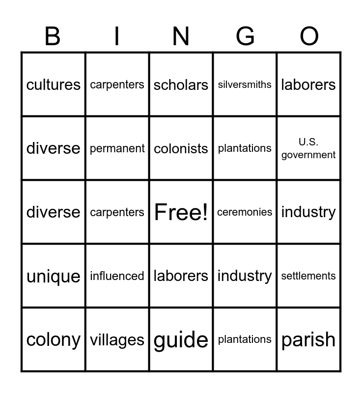 This bingo card has a free space and 38 words: colony, explorers, guide, permanent, settlements, influenced, colonists, enslaved people, laborers, plantations, carpenters, silversmiths, parish, industry, diverse, unique, artifacts, scholars, bayou, mound, ceremonies, cultures, villages, U.S. government, colony, explorers, guide, permanent, settlements, influenced, colonists, enslaved people, laborers, plantations, carpenters, silversmiths parish, industry, diverse and unique.