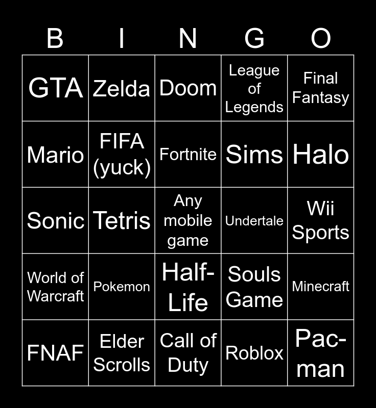 This bingo card has a free space and 24 words: Pokemon, Elder Scrolls, Fortnite, FNAF, Final Fantasy, GTA, Mario, Zelda, Undertale, Half-Life, Sims, Sonic, Souls Game, Minecraft, FIFA (yuck), Roblox, Wii Sports, Doom, Halo, Tetris, Pac-man, World of Warcraft, League of Legends and Call of Duty.
