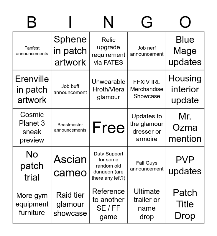 This bingo card has a free space and 47 words: New patch trailer, Patch Title Drop, Q&A to Feedback portion, Reference to another SE / FF game, Ascian cameo, Krile in patch artwork, Sphene in patch artwork, Wuk Lamat in patch artwork, Erenville in patch artwork, Calyx cameo, Job buff announcement, Job nerf announcement, PVP updates, Fall Guys announcement, Graphics update, Free fanta, Unwearable Hroth/Viera glamour, Updates to the glamour dresser or armoire, Whiteboard / Raid Planner gets delayed (again), Blue Mage updates, Beastmaster announcements, Ultimate trailer or name drop, Fanfest announcements, FFXIV IRL Merchandise Showcase, New housing wards / cities, Housing interior update, More gym equipment furniture, Random QoL Feature, Duty Support for some random old dungeon (are there any left?), No patch trial, Secret trial boss, Susano / Lakshmi Unreal, Shinryu / Tsukuyomi Unreal, Mogtome Announcement, YoshiP showcasing new raid tier using BLM, Raid tier glamour showcase, Mr. Ozma mention, Variant/Criterion Dungeon walkaround, Mogstore Items, Relic upgrade requirement via duties, Relic upgrade requirement via OC, Relic upgrade requirement via FATES, Cosmic Planet 3 sneak preview, Occult Crescent improvements (not counting PH jobs), Forked Tower 2 Announcement, New OC zone is not called North Horn and Job rework mention / announcement.
