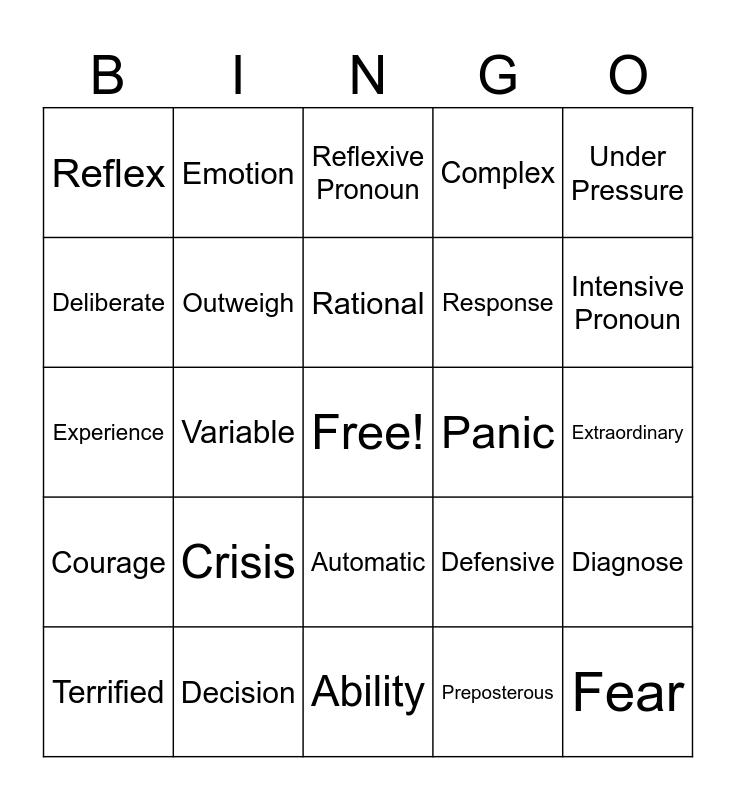 This bingo card has a free space and 24 words: Crisis, Decision, Rational, Terrified, Under Pressure, Reflex, Deliberate, Emotion, Panic, Automatic, Response, Experience, Defensive, Diagnose, Outweigh, Preposterous, Extraordinary, Reflexive Pronoun, Intensive Pronoun, Variable, Fear, Courage, Complex and Ability.