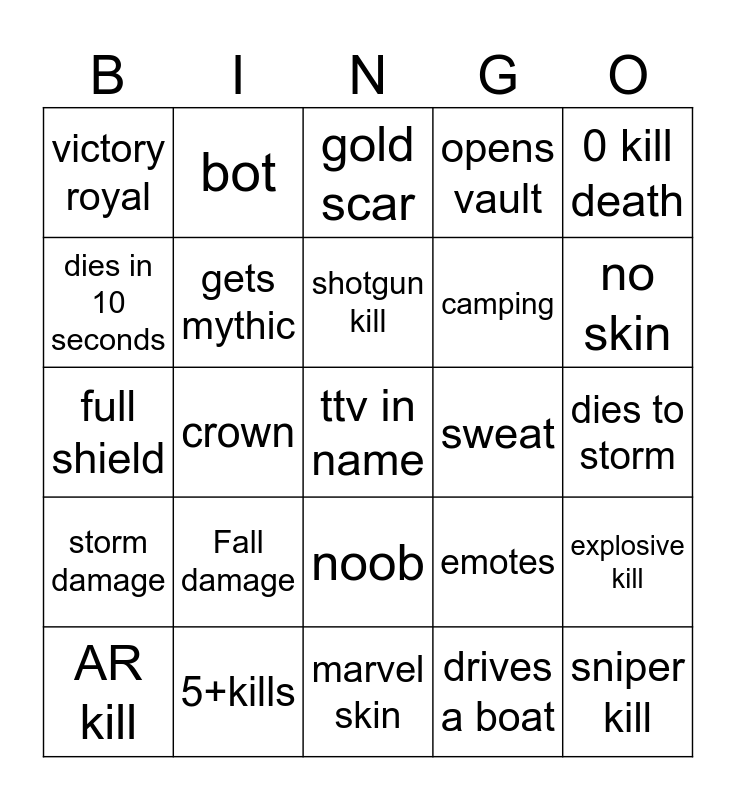 This bingo card has a free space and 24 words: Fall damage, 5+kills, shotgun kill, AR kill, 0 kill death, victory royal, dies in 10 seconds, bot, sweat, noob, camping, full shield, emotes, explosive kill, gets mythic, drives a boat, dies to storm, gold scar, no skin, crown, sniper kill, storm damage, opens vault and marvel skin.