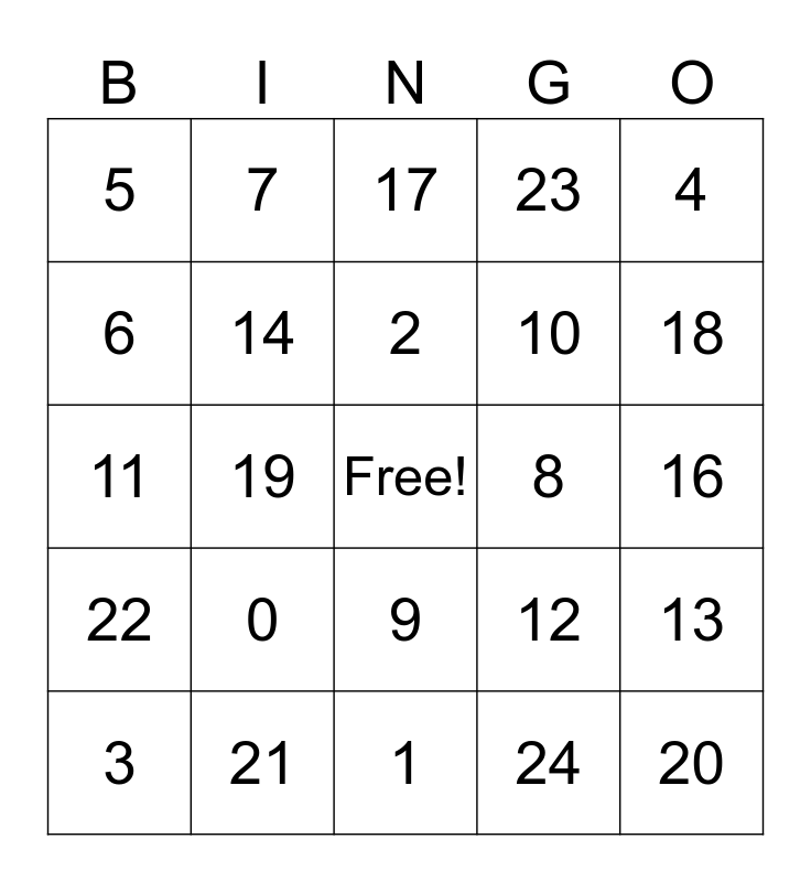 This bingo card has a free space and 25 words: 0, 1, 2, 3, 4, 5, 6, 7, 8, 9, 10, 11, 12, 13, 14, 15, 16, 17, 18, 19, 20, 21, 22, 23 and 24.