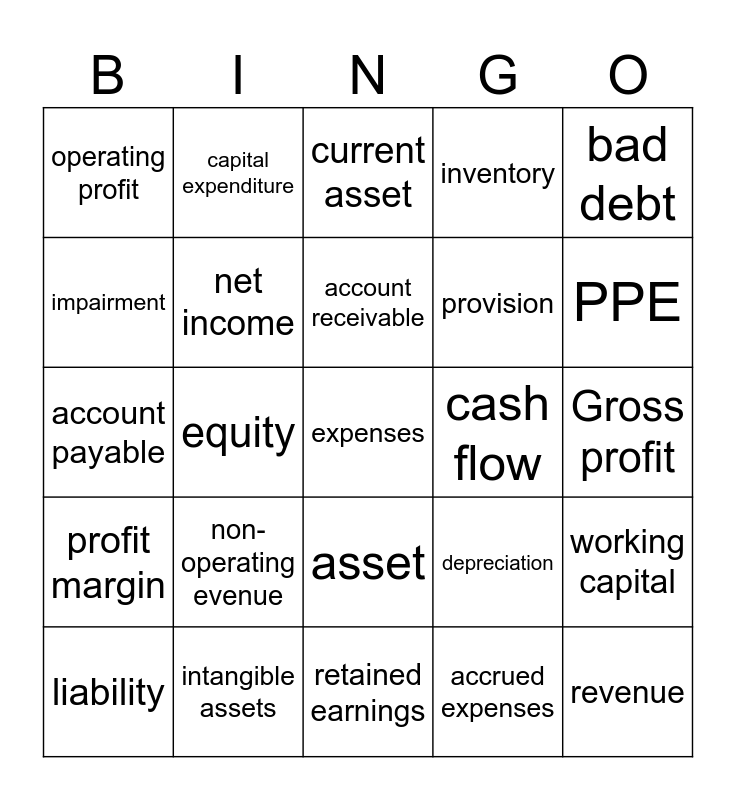 This bingo card has 25 words: non-operating evenue, retained earnings, account receivable, liability, bad debt, operating profit, impairment, capital expenditure, cash flow, asset, provision, account payable, depreciation, working capital, net income, revenue, Gross profit, current asset, PPE, equity, expenses, intangible assets, profit margin, inventory and accrued expenses.