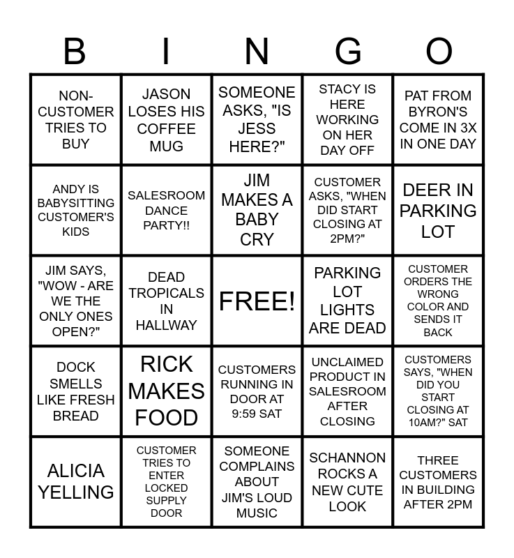 This bingo card has a free space and 24 words: RICK MAKES FOOD, CUSTOMER TRIES TO ENTER LOCKED SUPPLY DOOR, JIM MAKES A BABY CRY, ALICIA YELLING, PAT FROM BYRON'S COME IN 3X IN ONE DAY, NON-CUSTOMER TRIES TO BUY, ANDY IS BABYSITTING CUSTOMER'S KIDS, JASON LOSES HIS COFFEE MUG, PARKING LOT LIGHTS ARE DEAD, CUSTOMERS RUNNING IN DOOR AT 9:59 SAT, CUSTOMER ASKS, "WHEN DID START CLOSING AT 2PM?", JIM SAYS, "WOW - ARE WE THE ONLY ONES OPEN?", UNCLAIMED PRODUCT IN SALESROOM AFTER CLOSING, CUSTOMERS SAYS, "WHEN DID YOU START CLOSING AT 10AM?" SAT, SALESROOM DANCE PARTY!!, SCHANNON ROCKS A NEW CUTE LOOK, CUSTOMER ORDERS THE WRONG COLOR AND SENDS IT BACK, SOMEONE ASKS, "IS JESS HERE?", DEER IN PARKING LOT, DEAD TROPICALS IN HALLWAY, THREE CUSTOMERS IN BUILDING AFTER 2PM, DOCK SMELLS LIKE FRESH BREAD, STACY IS HERE WORKING ON HER DAY OFF and SOMEONE COMPLAINS ABOUT JIM'S LOUD MUSIC.