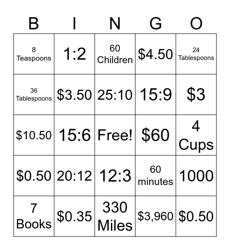 This bingo card has a free space and 64 words: 4/5, 4, 8, 1000, 12 Eggs, 2:5, 1:2, 3 Loaves, 25:10, 18:6:30, 12:3, 2 Cups, 4 Cups, 24 Tablespoons, 10 Cups, 36 Tablespoons, 15:6, 8 Teaspoons, 10:6, 15:9, 20:12, $0.50, $4.50, $8, $10, 4 Bottles, $0.75, $5.25, $32, $0.80, $1.50, $10.50, $7, $77, $3, 7 Books, $1,320, $3,960, $5,280, $3.50, $10.50, $60, $0.25, The price of one unit, $2.50, $0.50, $0.35, 0.5 pages, 60 minutes, $15, $1.85, $6.96, 330 Miles, 24 Gallons, 2 Adults, 45 Children, 60 Children, 65 Apples, 3:10, 15:37, Extra Free Space, Extra Free Space, Extra Free Space and Extra Free Space.