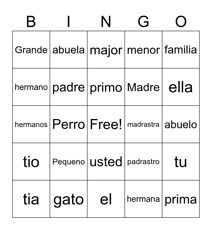 This bingo card has a free space and 24 words: Pequeno, gato, primo, tia, familia, Grande, hermano, abuela, madrastra, usted, Madre, hermanos, padrastro, tu, padre, hermana, abuelo, major, ella, Perro, prima, tio, menor and el.
