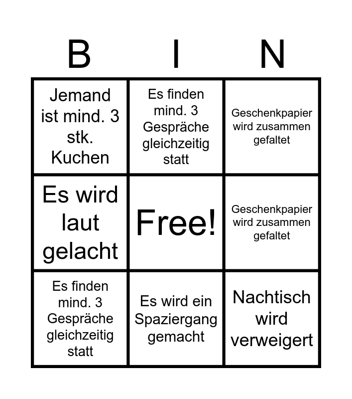⚠ This card has duplicate items: Es finden mind. 3 Gespräche gleichzeitig statt (2), Geschenkpapier wird zusammen gefaltet (2)