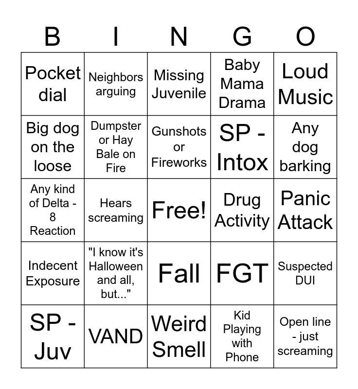 This bingo card has a free space and 24 words: "I know it's Halloween and all, but...", VAND, Gunshots or Fireworks, SP - Juv, Loud Music, Pocket dial, Big dog on the loose, Neighbors arguing, Drug Activity, Fall, SP - Intox, Any kind of Delta - 8 Reaction, FGT, Suspected DUI, Dumpster or Hay Bale on Fire, Kid Playing with Phone, Panic Attack, Missing Juvenile, Any dog barking, Hears screaming, Open line - just screaming, Indecent Exposure, Baby Mama Drama and Weird Smell.