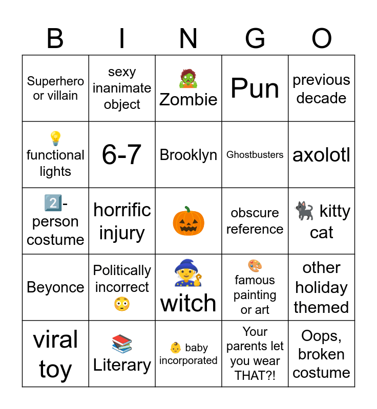 This bingo card has a free space and 42 words: NYC, Brooklyn, Political, Politically incorrect 😳, Your parents let you wear THAT?!, other holiday themed, Oops, broken costume, 🦕 dinosaur, 🧟 Zombie, 🧙witch, 🐈⬛ kitty cat, axolotl, horrific injury, previous decade, meme, 🎨 famous painting or art, something edible, 2️⃣-person costume, 3️⃣-person costume, sexy inanimate object, 💡 functional lights, 🐩 pet dog included in costume, 🪱 RJK Jr’s brain worm, Superhero or villain, Beetlejuice theme, Andor theme, Ghostbusters, Minecraft, KPop Demon Hunters, T. Ocellus (Alien Earth), Taylor Swift, Beyonce, 6-7, 👶 baby incorporated, 🫄big belly incorporated, viral toy, 📚Literary, obscure reference, legit terrifying, 🩸So. Much. Blood., Pun and ⚾️ Sports.