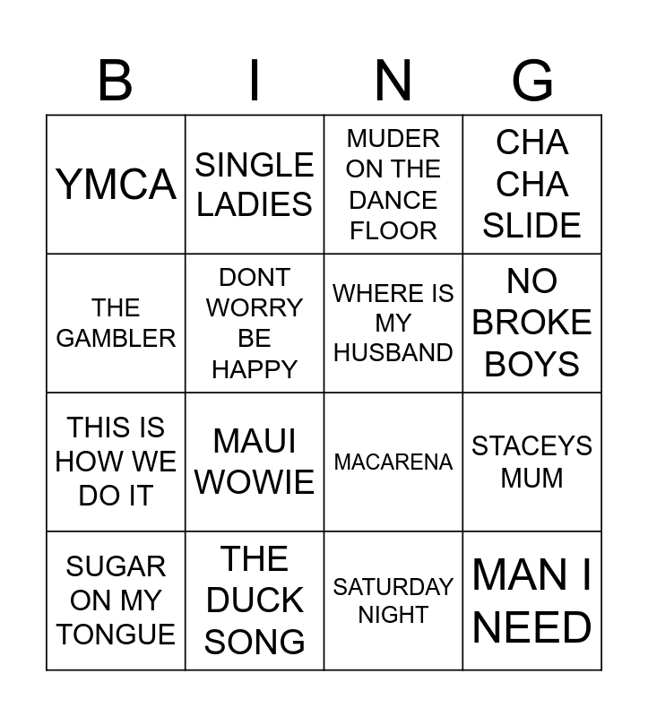 This bingo card has 16 words: THE DUCK SONG, STACEYS MUM, MUDER ON THE DANCE FLOOR, YMCA, THIS IS HOW WE DO IT, SINGLE LADIES, MACARENA, SATURDAY NIGHT, THE GAMBLER, DONT WORRY BE HAPPY, SUGAR ON MY TONGUE, CHA CHA SLIDE, MAUI WOWIE, NO BROKE BOYS, WHERE IS MY HUSBAND and MAN I NEED.