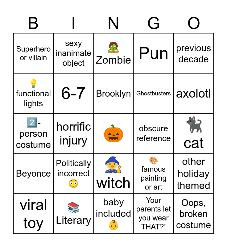 This bingo card has a free space and 42 words: NYC, Brooklyn, Political, Politically incorrect 😳, Your parents let you wear THAT?!, other holiday themed, Oops, broken costume, 🦕 dinosaur, 🧟 Zombie, 🧙witch, 🐈⬛ cat, axolotl, horrific injury, previous decade, meme, 🎨 famous painting or art, something edible, 2️⃣-person costume, 3️⃣-person costume, sexy inanimate object, 💡 functional lights, 🐩 includes pet dog, 🪱 RJK Jr’s brain worm, Superhero or villain, Beetlejuice, Andor, Ghostbusters, Minecraft, KPop Demon Hunters, T. Ocellus (Alien Earth), Taylor Swift, Beyonce, 6-7, baby included 👶, big belly included 🫄, viral toy, 📚Literary, obscure reference, legit terrifying, So. Much. Blood., Pun and ⚾️ Sports.