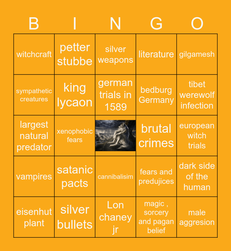 This bingo card has a free space and 24 words: satanic pacts, silver bullets, german trials in 1589, eisenhut plant, gilgamesh, witchcraft, sympathetic creatures, petter stubbe, brutal crimes, cannibalisim, bedburg Germany, largest natural predator, fears and predujices, dark side of the human, king lycaon, magic , sorcery and pagan belief, european witch trials, silver weapons, tibet werewolf infection, xenophobic fears, male aggresion, vampires, literature and Lon chaney jr.