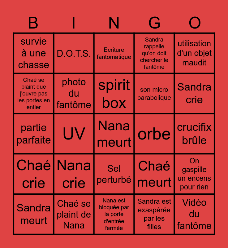 This bingo card has a free space and 24 words: Sandra meurt, Nana crie, spirit box, Sandra est exaspérée par les filles, utilisation d'un objet maudit, survie à une chasse, D.O.T.S., Ecriture fantomatique, orbe, crucifix brûle, partie parfaite, photo du fantôme, Chaé meurt, On gaspille un encens pour rien, Chaé se plaint que j'ouvre pas les portes en entier, Chaé se plaint de Nana, Nana est bloquée par la porte d'entrée fermée, Sandra rappelle qu'on doit chercher le fantôme, Sandra crie, Chaé crie, UV, Sel perturbé, son micro parabolique and Vidéo du fantôme.