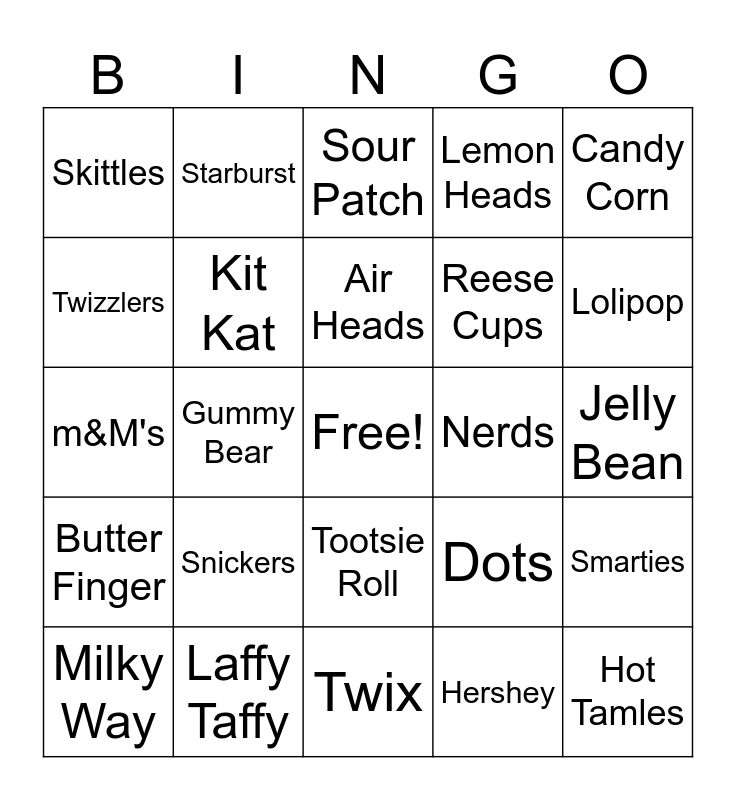 This bingo card has a free space and 24 words: Snickers, Laffy Taffy, Air Heads, Milky Way, Candy Corn, Skittles, Twizzlers, Starburst, Nerds, Tootsie Roll, Reese Cups, m&M's, Dots, Smarties, Kit Kat, Hershey, Jelly Bean, Sour Patch, Lolipop, Gummy Bear, Hot Tamles, Butter Finger, Lemon Heads and Twix.
