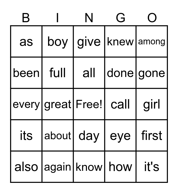 This bingo card has a free space and 24 words: about, again, all, also, among, as, been, boy, call, day, done, every, eye, first, full, how, girl, give, gone, great, it's, its, knew and know.