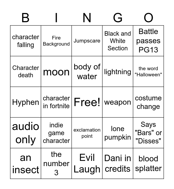 This bingo card has a free space and 27 words: lone pumpkin, lone tree, lightning, Evil Laugh, Character death, Jumpscare, Fire Background, audio only, weapon, Says "Bars" or "Disses", Hyphen, Black and White Section, an insect, the number 3, the word "Halloween", food, moon, body of water, indie game character, character falling, costume change, Dani in credits, character in fortnite, blood splatter, exclamation point, Battle passes PG13 and wooden floor.