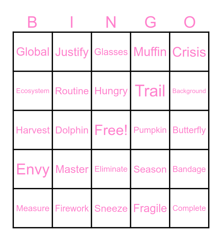 This bingo card has a free space and 24 words: Master, Firework, Hungry, Measure, Crisis, Global, Ecosystem, Justify, Pumpkin, Eliminate, Trail, Harvest, Season, Bandage, Routine, Fragile, Butterfly, Glasses, Background, Dolphin, Complete, Envy, Muffin and Sneeze.