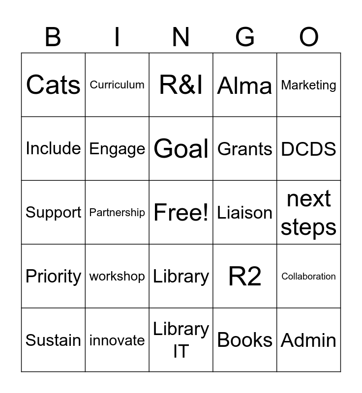 This bingo card has a free space and 28 words: Collaboration, Access Services, Grants, Books, Include, R&I, Curriculum, Priority, Liaison, Sustain, Support, Alma, innovate, Library IT, DCDS, content management, workshop, Engage, Goal, Library, Cats, Educate, Admin, Partnership, next steps, R2, Marketing and Donors.