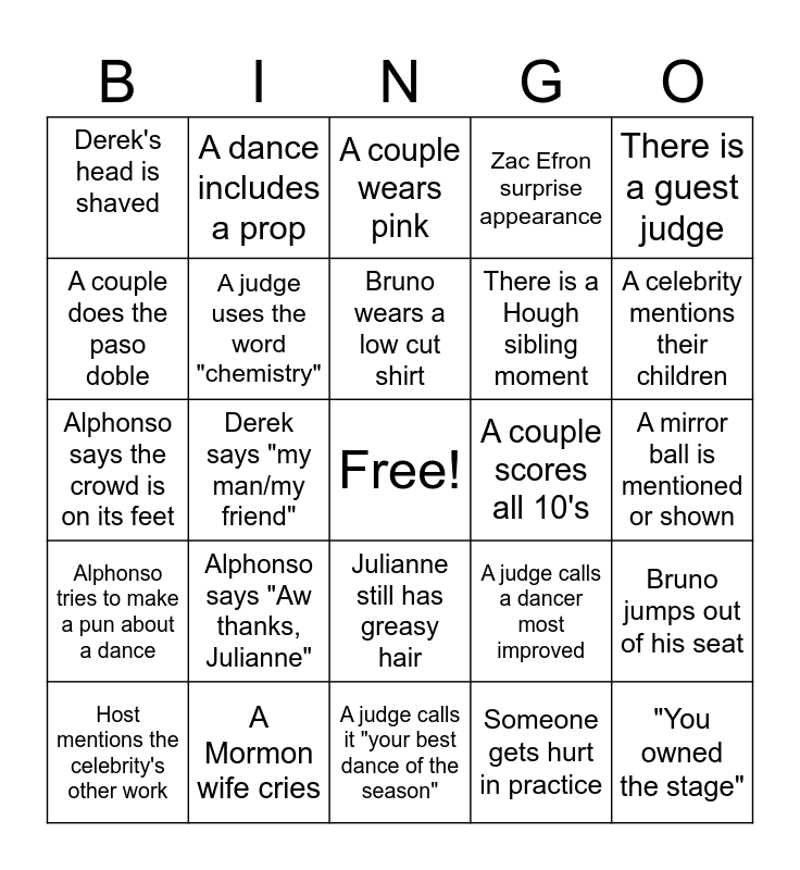 This bingo card has a free space and 24 words: Alphonso says "Aw thanks, Julianne", A Mormon wife cries, Bruno wears a low cut shirt, Host mentions the celebrity's other work, There is a guest judge, Derek's head is shaved, A couple does the paso doble, A dance includes a prop, A couple scores all 10's, Julianne still has greasy hair, There is a Hough sibling moment, Alphonso says the crowd is on its feet, A judge calls a dancer most improved, Bruno jumps out of his seat, A judge uses the word "chemistry", Someone gets hurt in practice, A mirror ball is mentioned or shown, A couple wears pink, A celebrity mentions their children, Derek says "my man/my friend", "You owned the stage", Alphonso tries to make a pun about a dance, Zac Efron surprise appearance and A judge calls it "your best dance of the season".