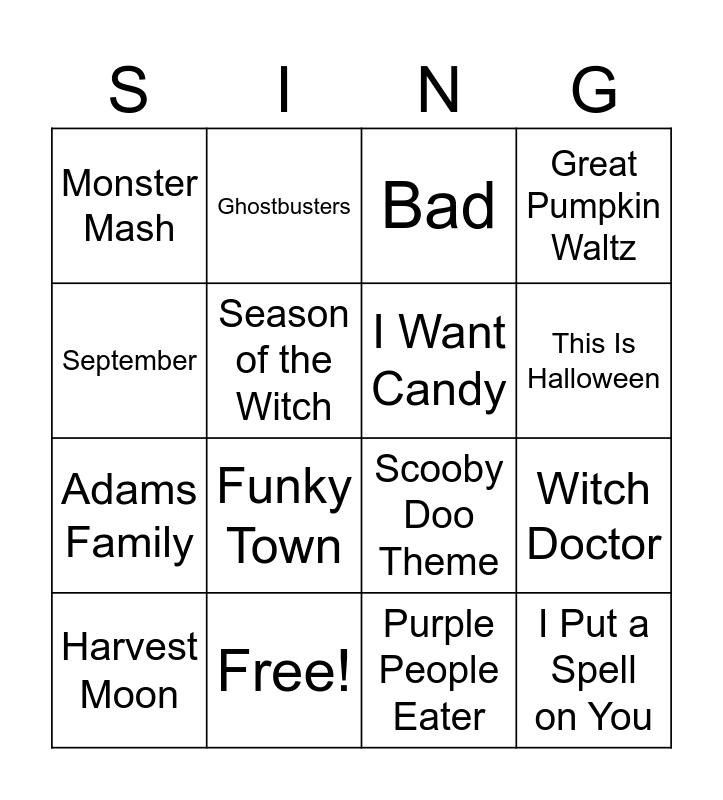 This bingo card has 21 words: Free!, Thriller, Ghostbusters, Spooky, Scary, Skeletons, Purple People Eater, I Want Candy, Monster Mash, Bad, Scooby Doo Theme, This Is Halloween, Adams Family, Great Pumpkin Waltz, I Put a Spell on You, Goo Goo Muck, Season of the Witch, ‘Tis Autumn, Harvest Moon, Funky Town, September, Witch Doctor and Wake Me Up When September Ends.