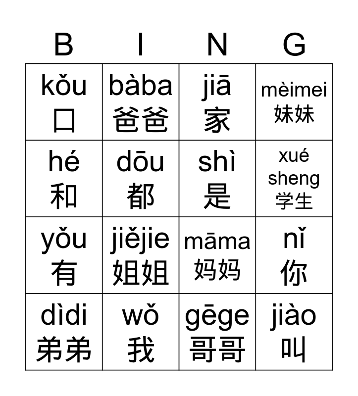 This bingo card has 16 words: wǒ 我, nǐ 你, jiā 家, kǒu 口, yǒu 有, bàba 爸爸, māma 妈妈, gēge 哥哥, hé 和, dōu 都, dìdi 弟弟, mèimei 妹妹, jiějie 姐姐, xué sheng 学生, shì 是 and jiào 叫.