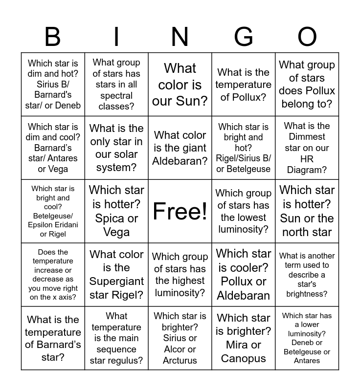 This bingo card has a free space and 24 words: What color is the Supergiant star Rigel?, What temperature is the main sequence star regulus?, What color is the giant Aldebaran?, What is the temperature of Barnard’s star?, What group of stars does Pollux belong to?, Which star is dim and hot? Sirius B/ Barnard's star/ or Deneb, Which star is dim and cool? Barnard’s star/ Antares or Vega, What group of stars has stars in all spectral classes?, Which group of stars has the lowest luminosity?, Which group of stars has the highest luminosity?, Which star is bright and hot? Rigel/Sirius B/ or Betelgeuse, Which star is bright and cool? Betelgeuse/ Epsilon Eridani or Rigel, Which star is cooler? Pollux or Aldebaran, What is another term used to describe a star's brightness?, What is the only star in our solar system?, Which star is brighter? Mira or Canopus, Which star is hotter? Sun or the north star, What color is our Sun?, What is the Dimmest star on our HR Diagram?, Which star is hotter? Spica or Vega, Which star has a lower luminosity? Deneb or Betelgeuse or Antares, Does the temperature increase or decrease as you move right on the x axis?, What is the temperature of Pollux? and Which star is brighter? Sirius or Alcor or Arcturus.