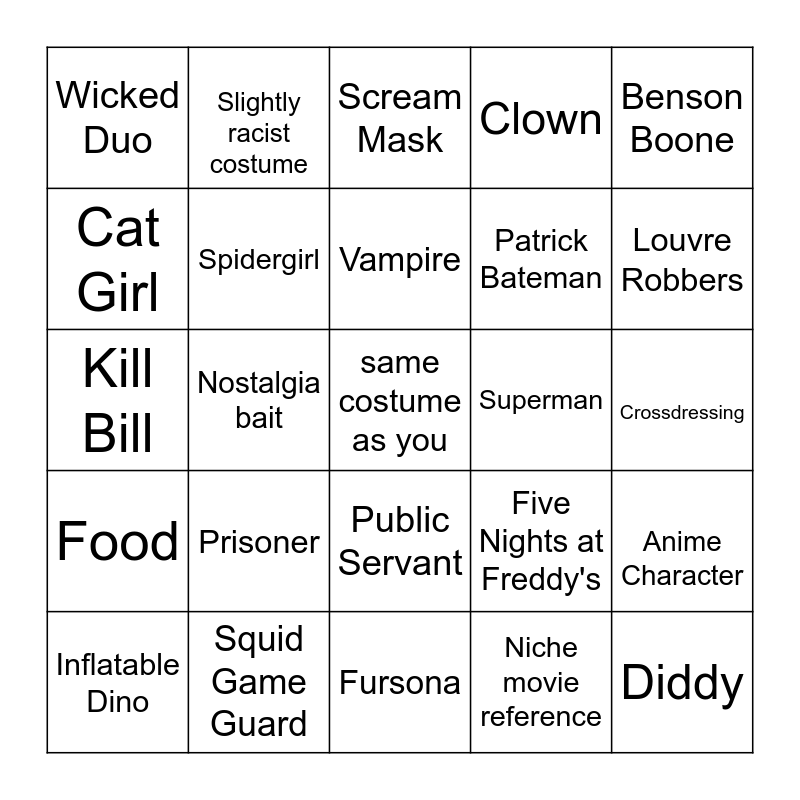 This bingo card has a free space and 24 words: Prisoner, Squid Game Guard, Vampire, Inflatable Dino, Benson Boone, Wicked Duo, Cat Girl, Slightly racist costume, Superman, Public Servant, Patrick Bateman, Kill Bill, Five Nights at Freddy's, Anime Character, Spidergirl, Niche movie reference, Crossdressing, Scream Mask, Louvre Robbers, Nostalgia bait, Diddy, Food, Clown and Fursona.