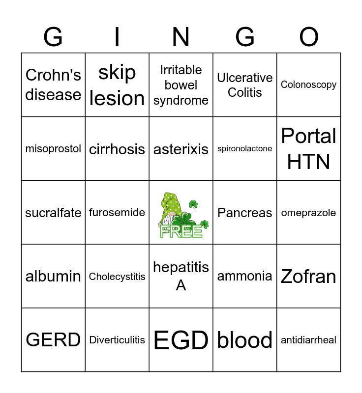 This bingo card has a free space and 24 words: GERD, Cholecystitis, asterixis, blood, Colonoscopy, Crohn's disease, skip lesion, Irritable bowel syndrome, Pancreas, omeprazole, sucralfate, cirrhosis, ammonia, Zofran, misoprostol, Diverticulitis, EGD, Ulcerative Colitis, Portal HTN, albumin, furosemide, hepatitis A, spironolactone and antidiarrheal.