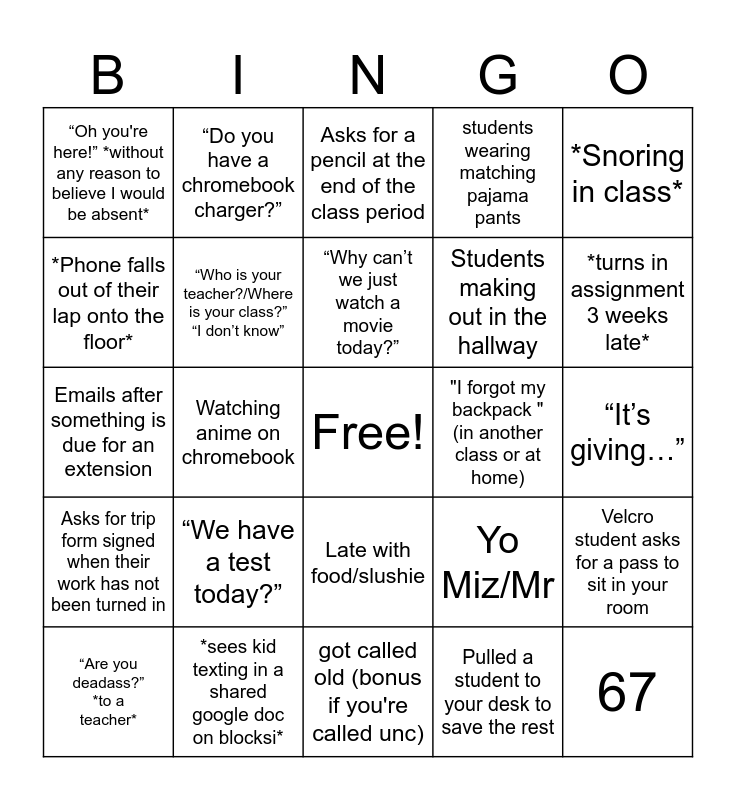 This bingo card has a free space and 24 words: “We have a test today?”, *sees kid texting in a shared google doc on blocksi*, “Why can’t we just watch a movie today?”, “Are you deadass?” *to a teacher*, *Snoring in class*, “Oh you're here!” *without any reason to believe I would be absent*, *Phone falls out of their lap onto the floor*, “Do you have a chromebook charger?”, "I forgot my backpack " (in another class or at home), Late with food/slushie, Students making out in the hallway, Emails after something is due for an extension, Yo Miz/Mr, Velcro student asks for a pass to sit in your room, “Who is your teacher?/Where is your class?” “I don’t know”, Pulled a student to your desk to save the rest, “It’s giving…”, Asks for a pencil at the end of the class period, *turns in assignment 3 weeks late*, Watching anime on chromebook, 67, Asks for trip form signed when their work has not been turned in, students wearing matching pajama pants and got called old (bonus if you're called unc).