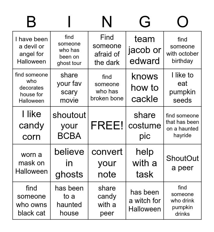 This bingo card has a free space and 24 words: believe in ghosts, has been to a haunted house, find someone who has broken bone, find someone who owns black cat, find someone with october birthday, I have been a devil or angel for Halloween, find someone who decorates house for Halloween, find someone who has been on ghost tour, share costume pic, convert your note, knows how to cackle, I like candy corn, help with a task, ShoutOut a peer, share your fav scary movie, has been a witch for Halloween, find someone that has been on a haunted hayride, Find someone afraid of the dark, I like to eat pumpkin seeds, shoutout your BCBA, find someone who drink pumpkin drinks, worn a mask on Halloween, team jacob or edward and share candy with a peer.