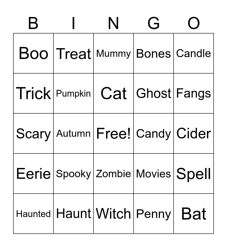 This bingo card has a free space and 25 words: Spooky, Witch, Cat, Haunted, Candle, Boo, Trick, Treat, Candy, Zombie, Ghost, Scary, Movies, Spell, Pumpkin, October, Cider, Mummy, Fangs, Autumn, Bat, Haunt, Eerie, Bones and Penny.