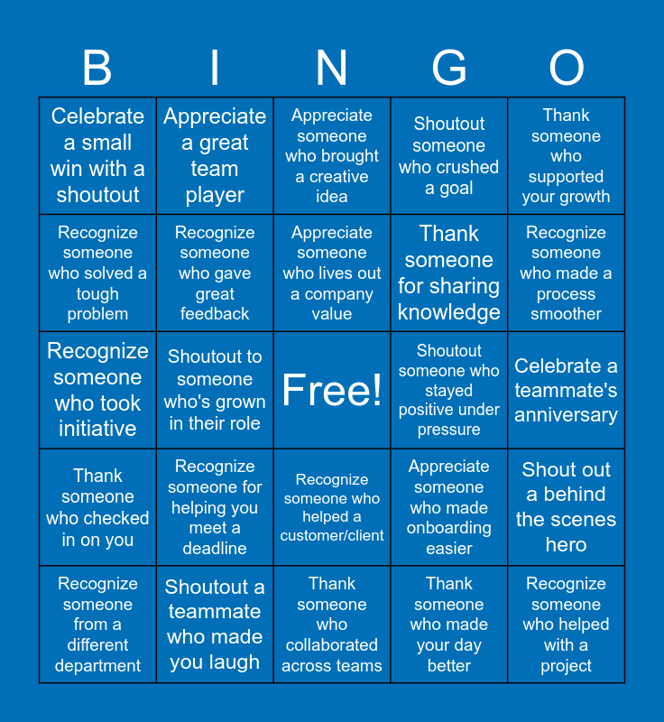 This bingo card has a free space and 24 words: Recognize someone for helping you meet a deadline, Shoutout a teammate who made you laugh, Appreciate someone who lives out a company value, Recognize someone from a different department, Thank someone who supported your growth, Celebrate a small win with a shoutout, Recognize someone who solved a tough problem, Appreciate a great team player, Shoutout someone who stayed positive under pressure, Recognize someone who helped a customer/client, Thank someone for sharing knowledge, Recognize someone who took initiative, Appreciate someone who made onboarding easier, Shout out a behind the scenes hero, Recognize someone who gave great feedback, Thank someone who made your day better, Celebrate a teammate's anniversary, Appreciate someone who brought a creative idea, Recognize someone who made a process smoother, Shoutout to someone who's grown in their role, Recognize someone who helped with a project, Thank someone who checked in on you, Shoutout someone who crushed a goal and Thank someone who collaborated across teams.