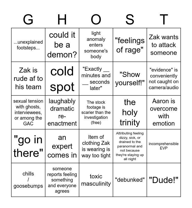 This bingo card has a free space and 24 words: an expert comes in, someone reports feeling something and everyone agrees, "Exactly __ minutes and __ seconds later", chills / goosebumps, Zak wants to attack someone, ...unexplained footsteps..., Zak is rude af to his team, could it be a demon?, the holy trinity, Item of clothing Zak is wearing is way too tight, "Show yourself!", sexual tension with ghosts, interviewees, or among the GAC, Attributing feeling dizzy, sick, or drained to the paranormal and not because they're staying up all night, incomprehensible EVP, cold spot, "debunked", Aaron is overcome with emotion, light anomaly enters someone's body, "evidence" is conveniently not caught on camera/audio, laughably dramatic re-enactment, "Dude!", "go in there", "feelings of rage" and toxic masculinity.