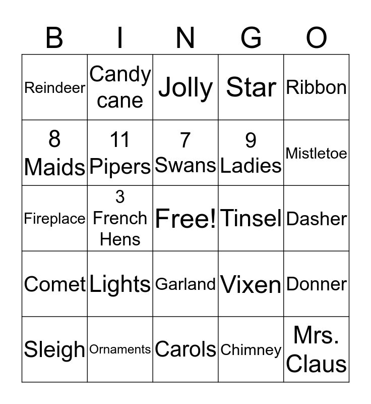 This bingo card has a free space and 45 words: Santa, Mrs. Claus, Toys, Sleigh, Elf, Chimney, Jolly, Christmas tree, Ribbon, Ornaments, Star, Tinsel, Garland, Lights, Bells, Carols, Stockings, Fireplace, Frosty, Mistletoe, Candy cane, Cookies, Holly, Reindeer, Rudolph, Dasher, Dancer, Prancer, Vixen, Comet, Cupid, Donner, Blitzen, 1 Partridge, 2 Turtle Doves, 3 French Hens, 4 Calling Birds, 5 Golden Rings, 6 Geese, 7 Swans, 8 Maids, 9 Ladies, 10 Lords, 11 Pipers and 12 Drummers.