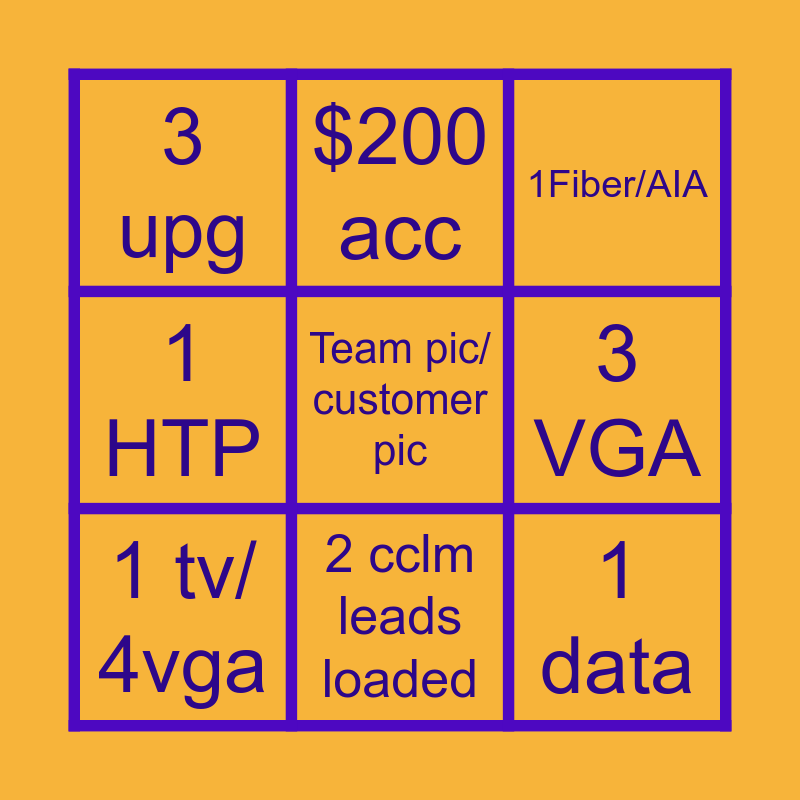 This bingo card has a free space and 8 words: 3 VGA, 1Fiber/AIA, $200 acc, 1 tv/ 4vga, 3 upg, 1 data, 1 HTP and 2 cclm leads loaded.
