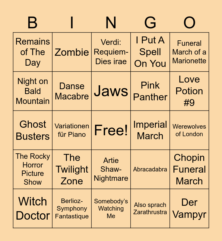 This bingo card has a free space and 40 words: Bach- Toccata and Fugue, Ghost Busters, Nightmare Before Christmas, Danse Macabre, Berlioz- Symphony Fantastique, Artie Shaw- Nightmare, Jaws, Oogie Boogie Song, Funeral March of a Marionette, The Rocky Horror Picture Show, Variationen für Piano, I Put A Spell On You, Der Vampyr, Werewolves of London, Imperial March, The Twilight Zone, O Fortuna, Remains of The Day, The Sorcerer’s Apprentice, Verdi: Requiem- Dies irae, Chopin Funeral March, Also sprach Zarathrustra, Pink Panther, Night on Bald Mountain, Thriller, Monster Mash, The Adams Family, Hungry Like The Wolf, Phsyco Suite, Liszt's Totentanz, Monster, Witch Doctor, The Beetle Juice – Banana Boat, Abracadabra, Love Potion #9, Somebody’s Watching Me, Superstition, Spooky Scary Skeletons, Zombie and Harry Potter- Hedwig.