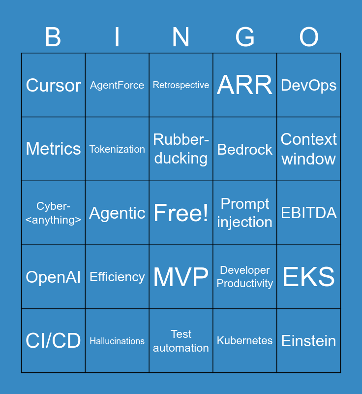 This bingo card has a free space and 72 words: Agent, AgentForce, Agentic, Anthropic, Apex, AppExchange, ARR, Automation, Bedrock, Brownfield, CI/CD, Claude, Context window, Cursor, Customer churn, Cyber-<anything>, Developer Productivity, DevOps, Ease The Pain, EBITDA, Efficiency, Einstein, EKS, Embeddings, Feature flags, Freemium, Fuse, Github Actions, Greenfield, Guardrails, Hallucinations, Initialization, Insights, K8s, Kubernetes, Least privilege, LLM, LWC or Lightning Web Components, Metrics, Microservice, MVP, Observability, Omni-<anything>, On my way!, Onboarding, OpenAI, Optimization, Paywall, Pipeline, Pivot, Postmortem, process automation, Prompt engineering, Prompt injection, RAG (Retrieval-Augmented Generation), Refactor, Retrospective, Rubber-ducking, Sales Cloud, Scope creep, Security, Streamline, Tech debt, Test automation, Test Data, The AI, Tokenization, Transformation, Unified, Vector database, Vibe coding and YOLO mode.