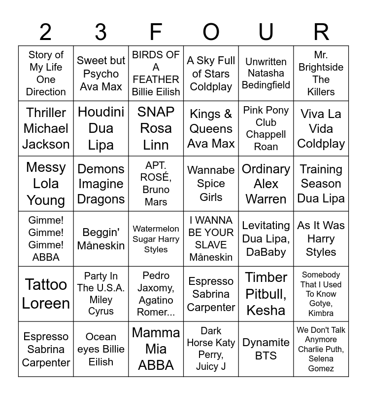 This bingo card has 36 words: Espresso Sabrina Carpenter, Pedro Jaxomy, Agatino Romer..., Dark Horse Katy Perry, Juicy J, Thriller Michael Jackson, Gimme! Gimme! Gimme! ABBA, Wannabe Spice Girls, Houdini Dua Lipa, Mamma Mia ABBA, Unwritten Natasha Bedingfield, Timber Pitbull, Kesha, Viva La Vida Coldplay, A Sky Full of Stars Coldplay, Somebody That I Used To Know Gotye, Kimbra, Demons Imagine Dragons, Kings & Queens Ava Max, Story of My Life One Direction, Tattoo Loreen, Ordinary Alex Warren, Messy Lola Young, BIRDS OF A FEATHER Billie Eilish, АРТ. ROSÉ, Bruno Mars, Beggin' Måneskin, I WANNA BE YOUR SLAVE Måneskin, Watermelon Sugar Harry Styles, Levitating Dua Lipa, DaBaby, Sweet but Psycho Ava Max, Pink Pony Club Chappell Roan, Ocean eyes Billie Eilish, SNAP Rosa Linn, Mr. Brightside The Killers, We Don't Talk Anymore Charlie Puth, Selena Gomez, Espresso Sabrina Carpenter, As It Was Harry Styles, Training Season Dua Lipa, Party In The U.S.A. Miley Cyrus and Dynamite BTS.