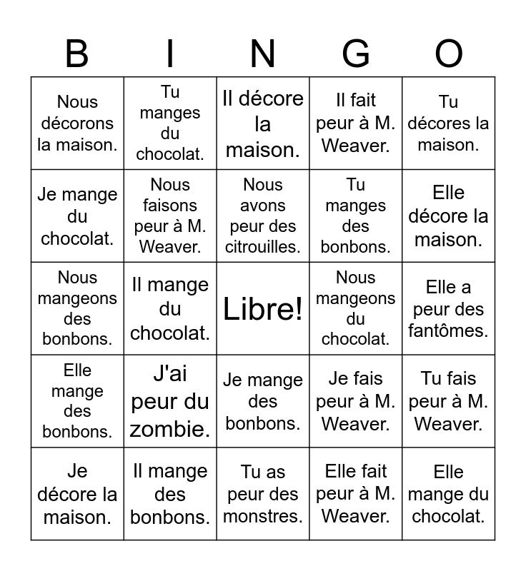 This bingo card has a free space and 25 words: J'ai peur du zombie., Tu as peur des monstres., Nous avons peur des citrouilles., Je décore la maison., Tu décores la maison., Nous décorons la maison., Je mange du chocolat., Tu manges du chocolat., Nous mangeons du chocolat., Je mange des bonbons., Tu manges des bonbons., Nous mangeons des bonbons., Je fais peur à M. Weaver., Tu fais peur à M. Weaver., Nous faisons peur à M. Weaver., Il a peur des fantômes., Elle a peur des fantômes., Il décore la maison., Elle décore la maison., Il mange du chocolat., Elle mange du chocolat., Il mange des bonbons., Elle mange des bonbons., Il fait peur à M. Weaver. and Elle fait peur à M. Weaver..