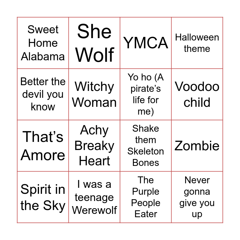 This bingo card has 49 words: Thriller, Spirit in the Sky, Frankenstein Twist, Trick or Treat, Incy Wincy Spider, Dead Man’s party, She Wolf, Ding Dong! The Witch is dead, Witchy Woman, Sympathy for the Devil, Yo ho (A pirate’s life for me), Halloween theme, Little Shop of Horrors, The Witch Queen of New Orleans, Poison, Psycho killer, Voodoo child, I was a teenage Werewolf, Smooth Criminal, Better the devil you know, Zombie, I put a spell on you, Sweet Home Alabama, That’s Amore, King of the Road, Achy Breaky Heart, Mamma Mia, Spice up your life, You give love a bad name, Never gonna give you up, Boom, boom, boom, boom, Livin’ la Vida Loca, Baggy Trousers, He’s the Greatest Dancer, Best Song Ever, Young hearts run free, Night Fever, Zombie Prom, The Purple People Eater, Devil Woman, Devil in Disguise, Sweet Transvestite, Phantom of the Opera, Bibbidi bobbodi boo, Shake them Skeleton Bones, YMCA, Sweet Caroline, Agadoo and Cigarettes and Alcohol.