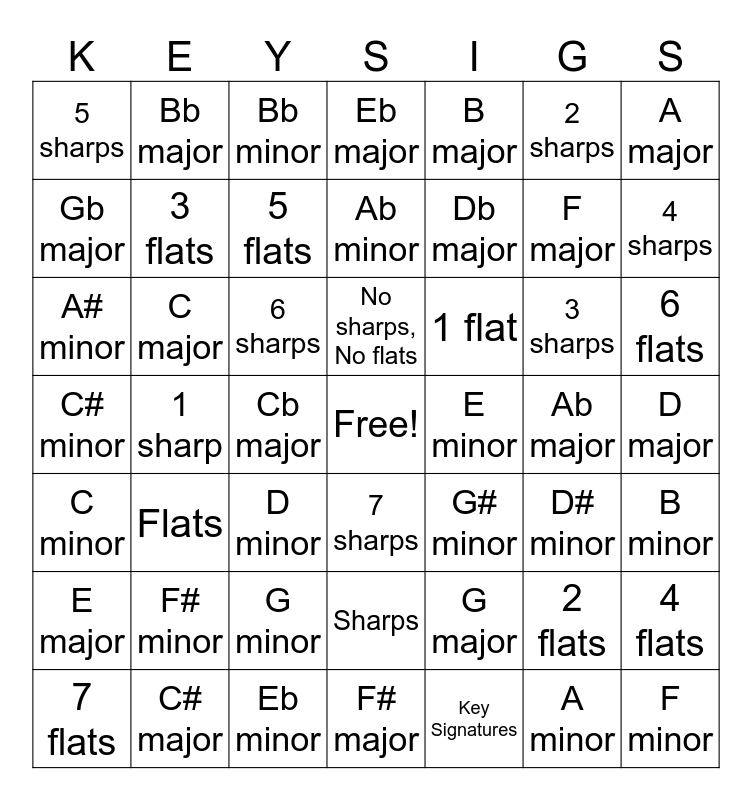 This bingo card has a free space and 48 words: G major, F major, F# major, 1 sharp, 6 sharps, D major, Bb major, C# major, 2 sharps, 7 sharps, A major, Eb major, 3 sharps, 1 flat, E major, Ab major, Gb major, 4 sharps, 2 flats, B major, Db major, Cb major, 5 sharps, 3 flats, 4 flats, 5 flats, 6 flats, 7 flats, No sharps, No flats, C major, A minor, E minor, B minor, F# minor, C# minor, G# minor, D# minor, A# minor, D minor, G minor, C minor, F minor, Bb minor, Eb minor, Ab minor, Sharps, Flats and Key Signatures.