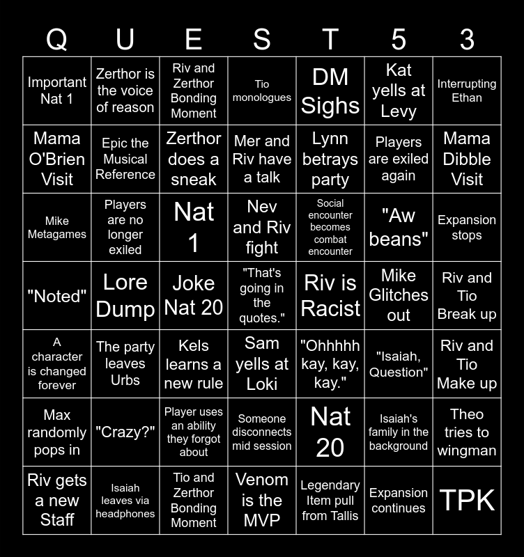 This bingo card has a free space and 48 words: Nat 20, Players are exiled again, Venom is the MVP, Lore Dump, Nat 1, Riv and Tio Break up, Zerthor is the voice of reason, Isaiah leaves via headphones, Kat yells at Levy, Sam yells at Loki, Interrupting Ethan, Tio monologues, "Aw beans", Social encounter becomes combat encounter, Max randomly pops in, Mike Glitches out, Mama O'Brien Visit, Mama Dibble Visit, Isaiah's family in the background, DM Sighs, Lynn betrays party, Joke Nat 20, Important Nat 1, Epic the Musical Reference, Theo tries to wingman, Zerthor does a sneak, Expansion stops, Riv gets a new Staff, Nev and Riv fight, Players are no longer exiled, Expansion continues, Riv is Racist, Riv and Tio Make up, "Crazy?", "Noted", "Ohhhhh kay, kay, kay.", "Isaiah, Question", Mike Metagames, Kels learns a new rule, Player uses an ability they forgot about, A character is changed forever, TPK, Riv and Zerthor Bonding Moment, Tio and Zerthor Bonding Moment, Mer and Riv have a talk, Someone disconnects mid session, The party leaves Urbs and Legendary Item pull from Tallis.