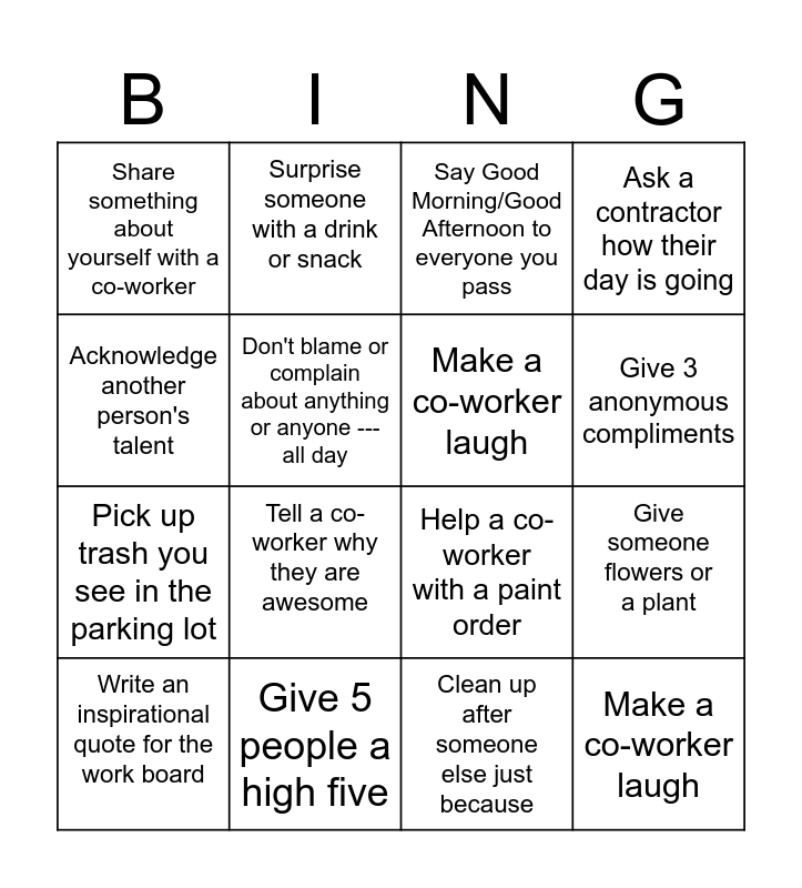 This bingo card has 16 words: Give 5 people a high five, Give someone flowers or a plant, Say Good Morning/Good Afternoon to everyone you pass, Share something about yourself with a co-worker, Pick up trash you see in the parking lot, Surprise someone with a drink or snack, Help a co-worker with a paint order, Clean up after someone else just because, Acknowledge another person's talent, Don't blame or complain about anything or anyone --- all day, Write an inspirational quote for the work board, Ask a contractor how their day is going, Tell a co-worker why they are awesome, Give 3 anonymous compliments, Make a co-worker laugh and Make a co-worker laugh.