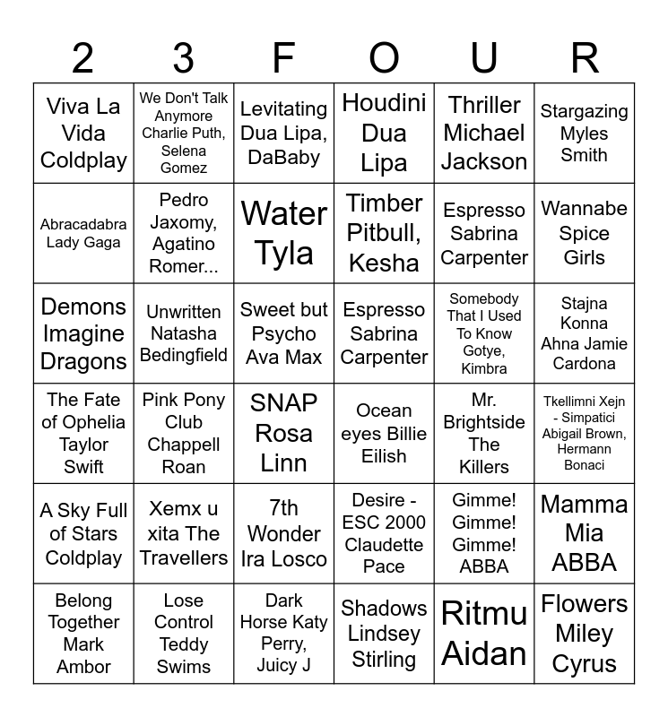 This bingo card has 36 words: Desire - ESC 2000 Claudette Pace, 7th Wonder Ira Losco, Shadows Lindsey Stirling, Abracadabra Lady Gaga, The Fate of Ophelia Taylor Swift, Espresso Sabrina Carpenter, Pedro Jaxomy, Agatino Romer..., Dark Horse Katy Perry, Juicy J, Thriller Michael Jackson, Gimme! Gimme! Gimme! ABBA, Wannabe Spice Girls, Houdini Dua Lipa, Mamma Mia ABBA, Unwritten Natasha Bedingfield, Timber Pitbull, Kesha, Viva La Vida Coldplay, A Sky Full of Stars Coldplay, Somebody That I Used To Know Gotye, Kimbra, Demons Imagine Dragons, Levitating Dua Lipa, DaBaby, Sweet but Psycho Ava Max, Pink Pony Club Chappell Roan, Ocean eyes Billie Eilish, SNAP Rosa Linn, Mr. Brightside The Killers, We Don't Talk Anymore Charlie Puth, Selena Gomez, Espresso Sabrina Carpenter, Lose Control Teddy Swims, Water Tyla, Stargazing Myles Smith, Flowers Miley Cyrus, Belong Together Mark Ambor, Tkellimni Xejn - Simpatici Abigail Brown, Hermann Bonaci, Stajna Konna Ahna Jamie Cardona, Xemx u xita The Travellers and Ritmu Aidan.