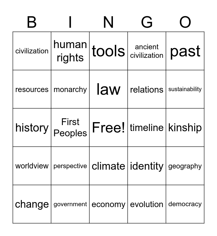 This bingo card has a free space and 24 words: perspective, government, law, change, past, civilization, resources, human rights, timeline, climate, relations, history, identity, geography, monarchy, evolution, kinship, tools, sustainability, First Peoples, democracy, worldview, ancient civilization and economy.