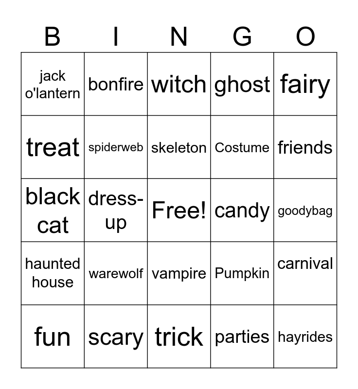 This bingo card has a free space and 27 words: Pumpkin, Bat, Costume, trick, treat, witch, bonfire, haunted house, candy, carnival, black cat, ghost, fun, scary, friends, family, spiderweb, skeleton, warewolf, jack o'lantern, goodybag, parties, dress-up, hayrides, vampire, fairy and lumberjack.