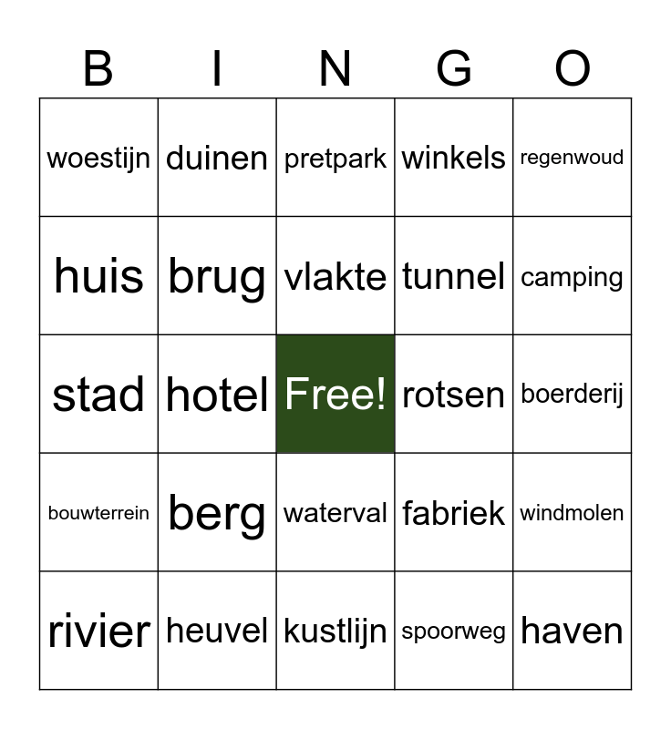 This bingo card has a free space and 24 words: berg, heuvel, vlakte, rivier, regenwoud, woestijn, huis, duinen, rotsen, waterval, tunnel, stad, fabriek, windmolen, brug, spoorweg, boerderij, pretpark, camping, hotel, haven, bouwterrein, winkels and kustlijn.